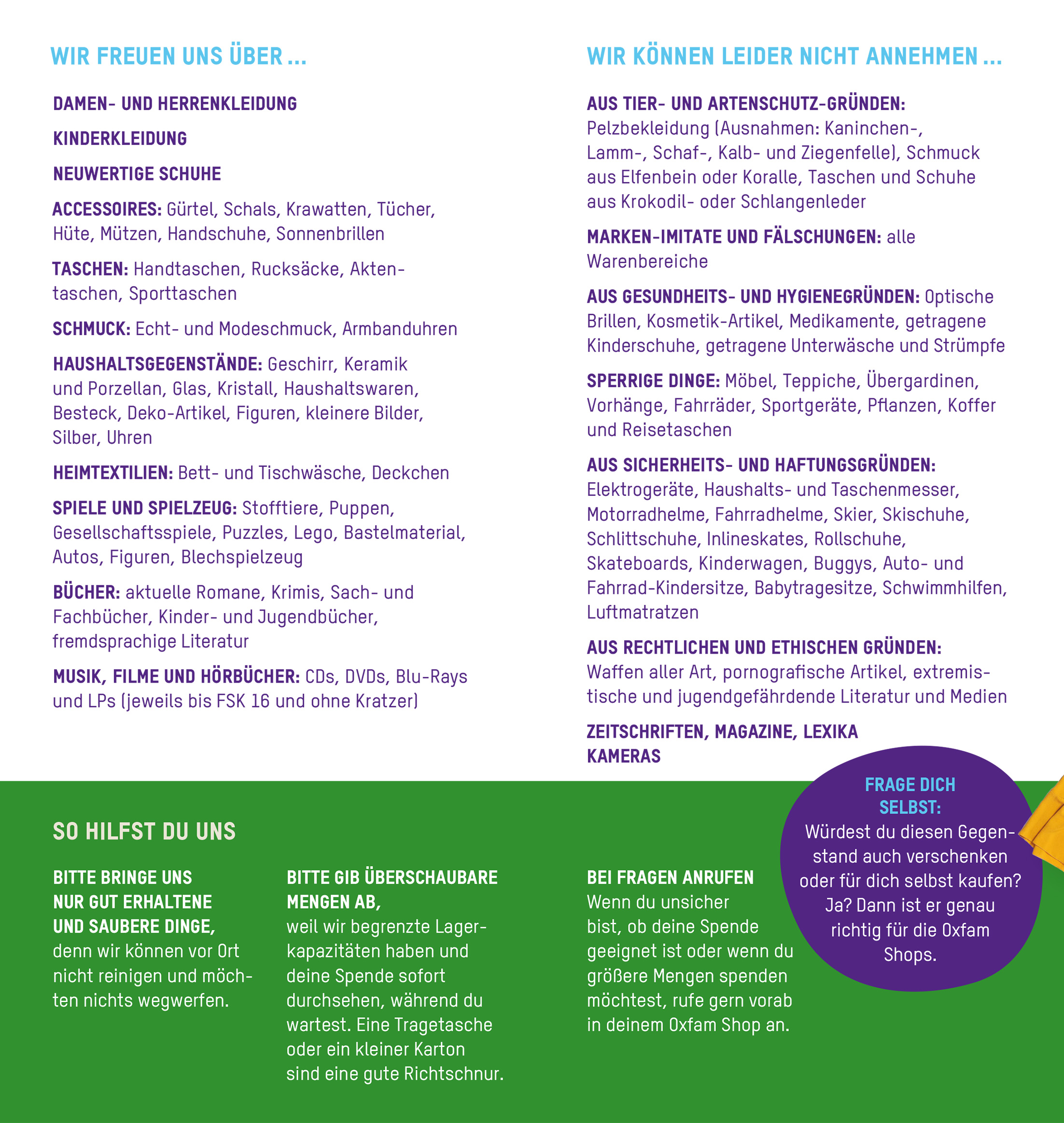 Eine Übersicht der Sachen, die wir annehmen und nicht annehmen, findest du hier.