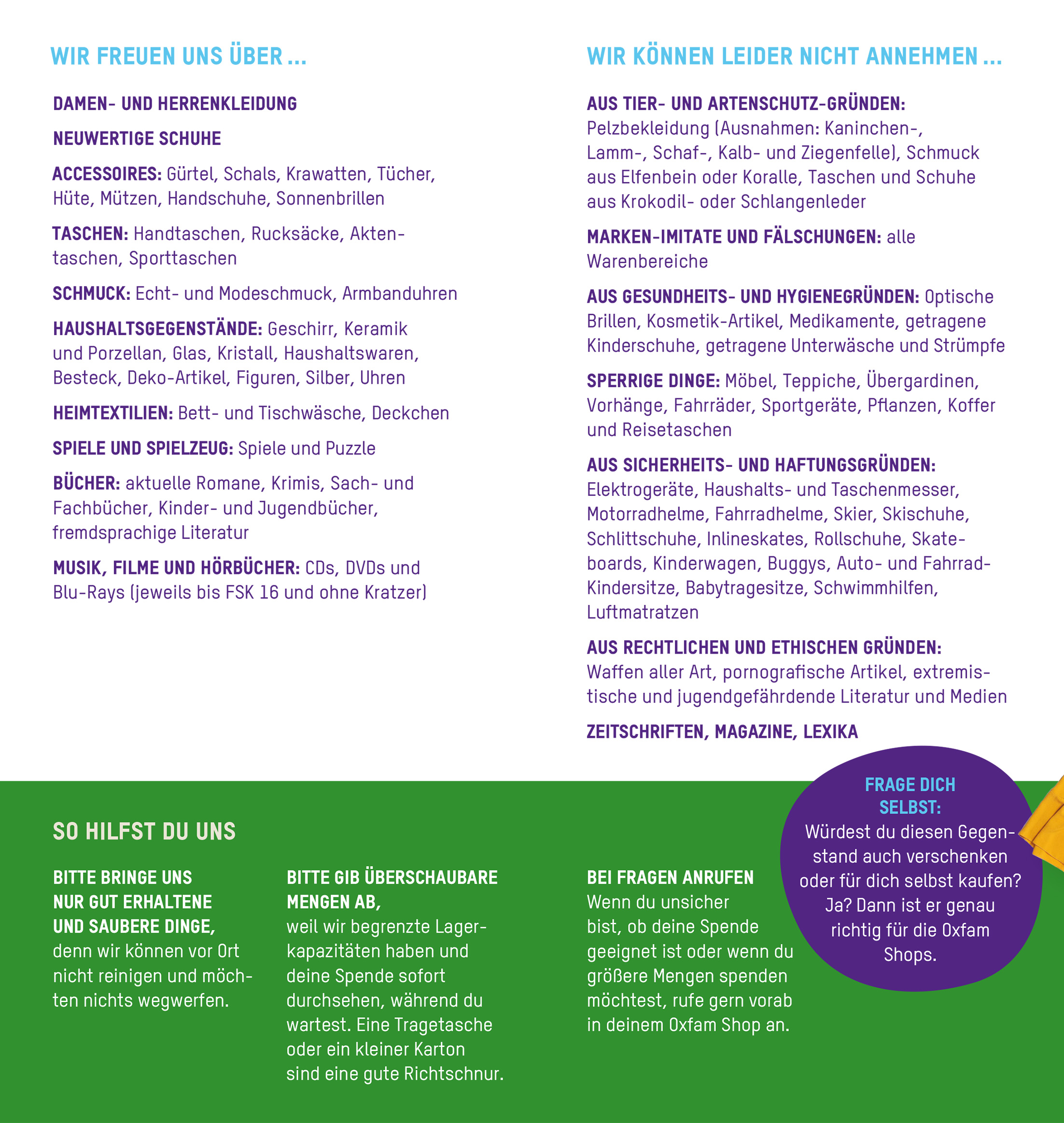 Eine Übersicht der Sachen, die wir annehmen und nicht annehmen, findest du hier.