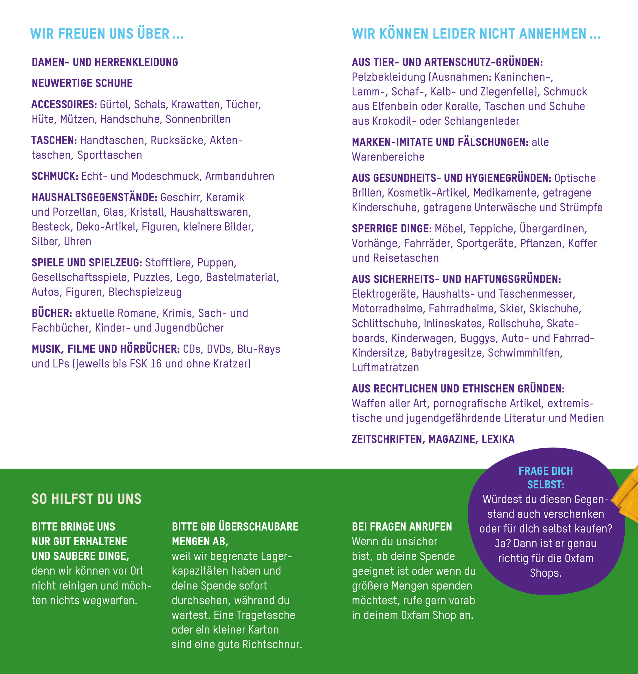Eine Übersicht der Sachen, die wir annehmen und nicht annehmen, findest du hier.
